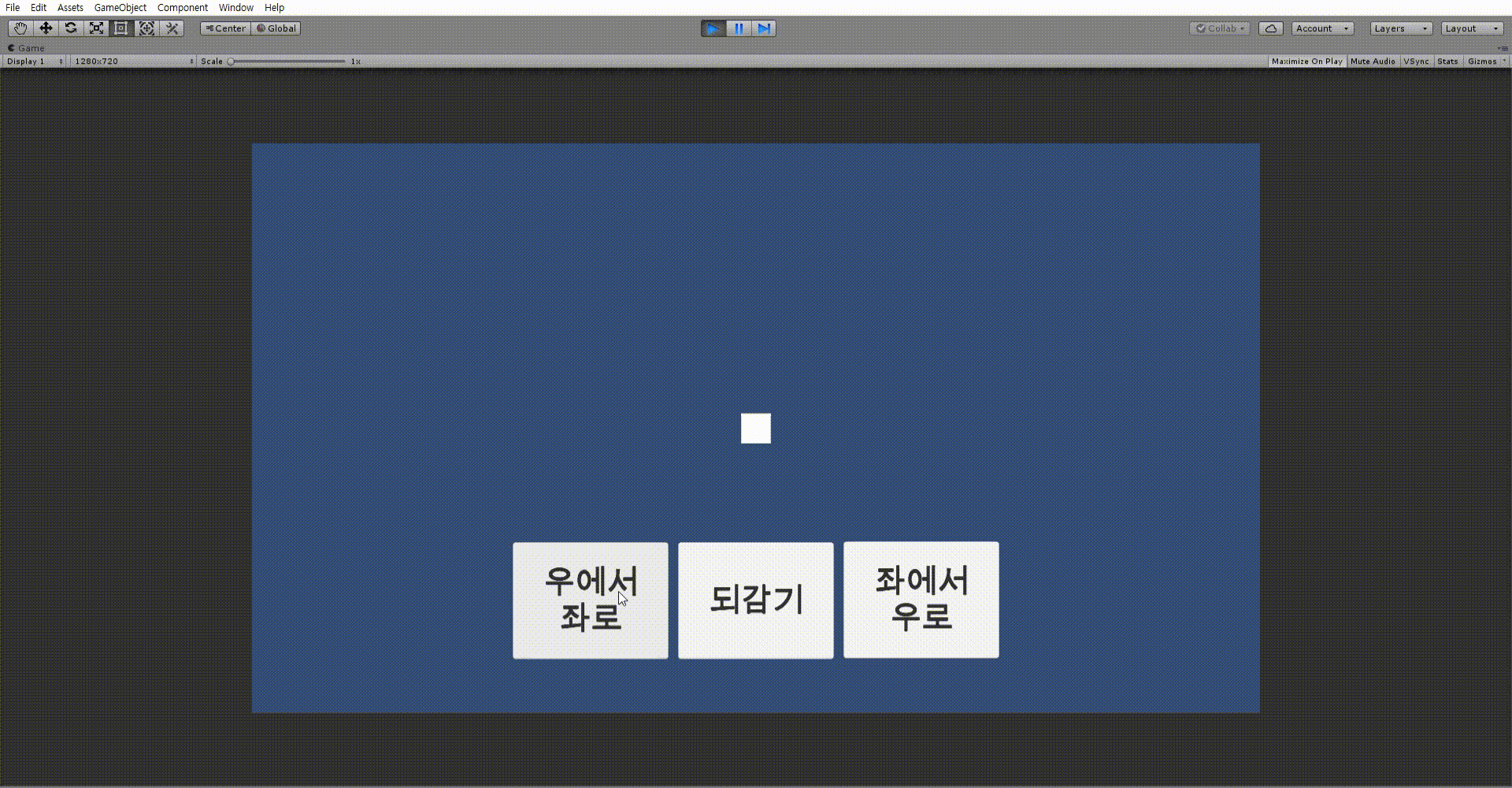 애니메이션의 역재생과 되감기 테스트 화면입니다.