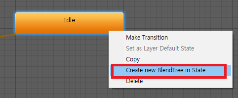블렌드 트리를 만들고자 하는 state를 선택하고 우클릭 Create new BlendTree in State를 선택한다.