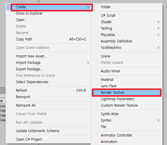 프로젝트 창에서 우클릭 Create > Render Texture를 생성합니다.