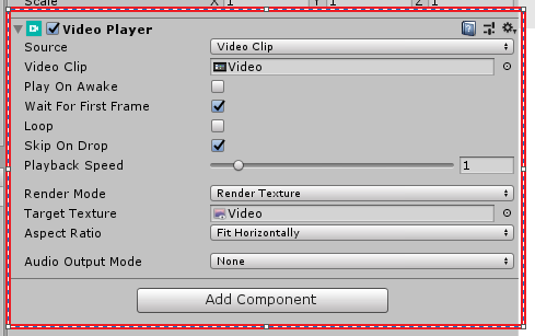컴포넌트를 추가하고 Video Clip에 재생할 비디오를 할당하고 Target Texture에 생성한 Render Texture를 할당합니다.