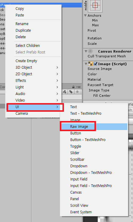 하이어 라키 창에서 우클릭 UI < Raw Image