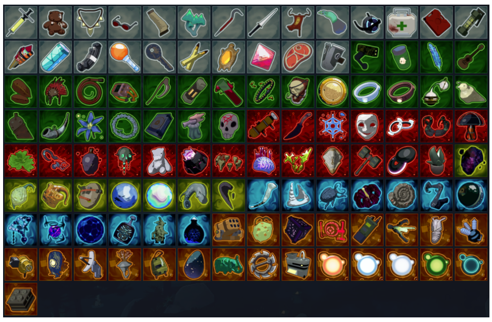 기본적으로 모든 아이템들은 해금 조건을 만족하면 로그북에 까만 실루엣으로 나타나게 되며, 차후 스테이지에서 해당 아이템을 습득하면 완전한 모습이 나타난다. 아이템의 유형이나 희귀도��