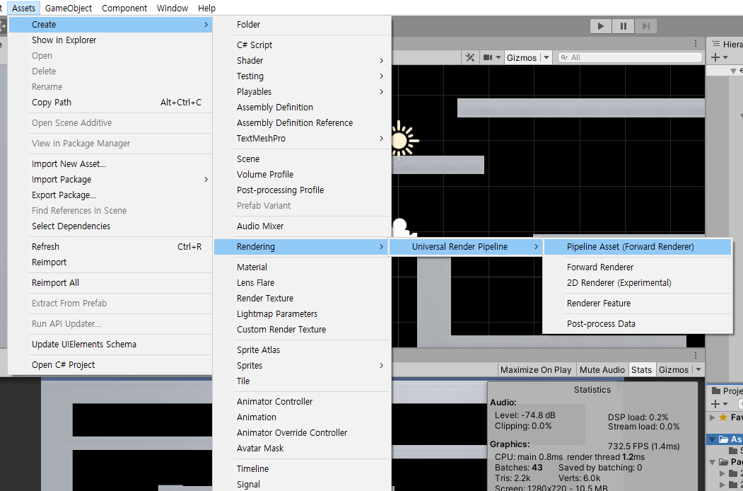 Asset > Create > Rendering > Universal RenderPipeline에서 Pipeline Asset과 2D Renderer를 생성합니다.