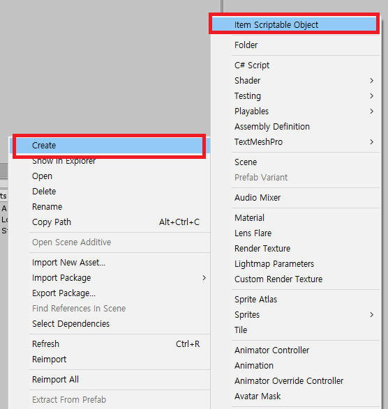 Asset > Create로 들어가 보시면 방금 작성하였던 ScriptableObject를 생성할 수 있습니다.