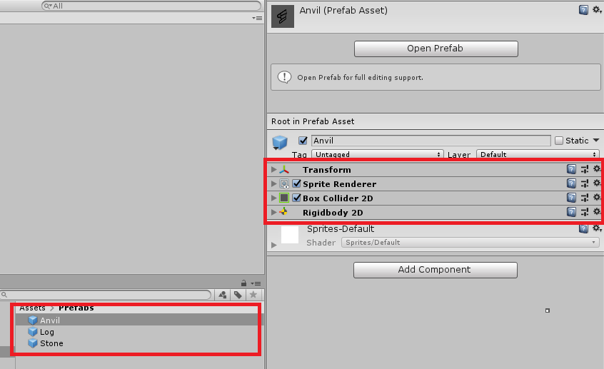 스프라이트를 포함하는 임의의 오브젝트 프리팹 3가지를 준비하고