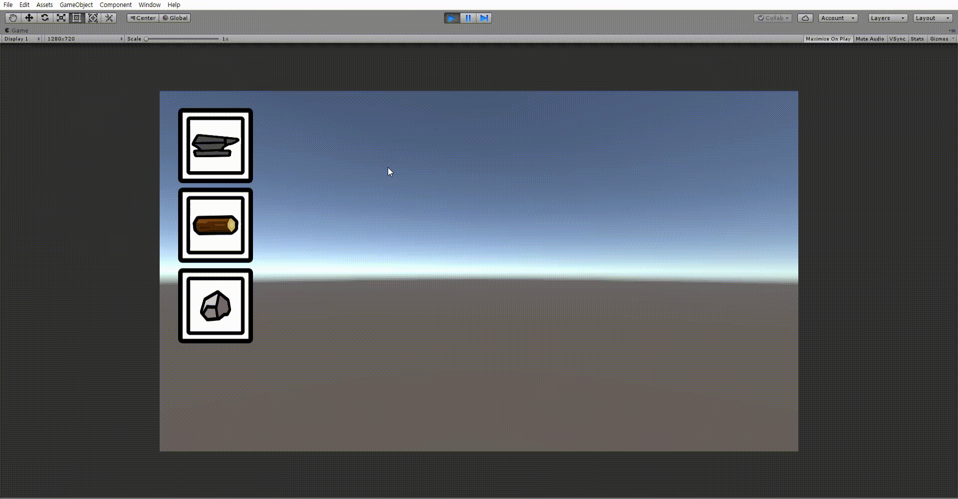 ScriptableObject를 활용하여 오브젝트를 생성하고 UI버튼을 이용하여 생성시킬 아이템을 전환시키는 화면입니다.