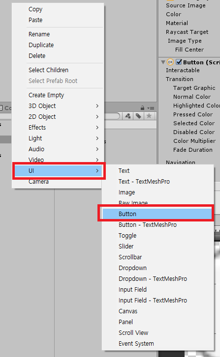 1. 하이어 라키 창에서 우클릭 UI Button 생성