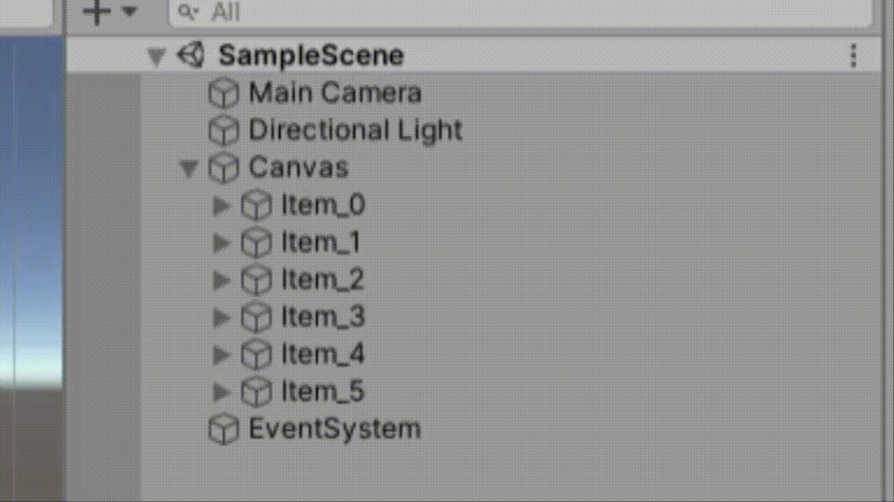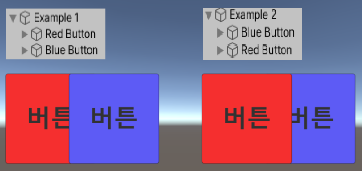 캔버스 UI 오브젝트들은 하이어라키 상의 하단에 위치할 수 록 먼저 보이게 됩니다.